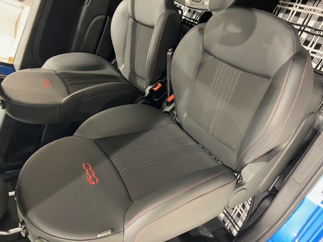 FIAT 500 SPORTインテリアをご紹介します。テクノレザーとファブリックを組み合わせた専用シートになっており、ブラックシートにレッドステッチでスポーティ...